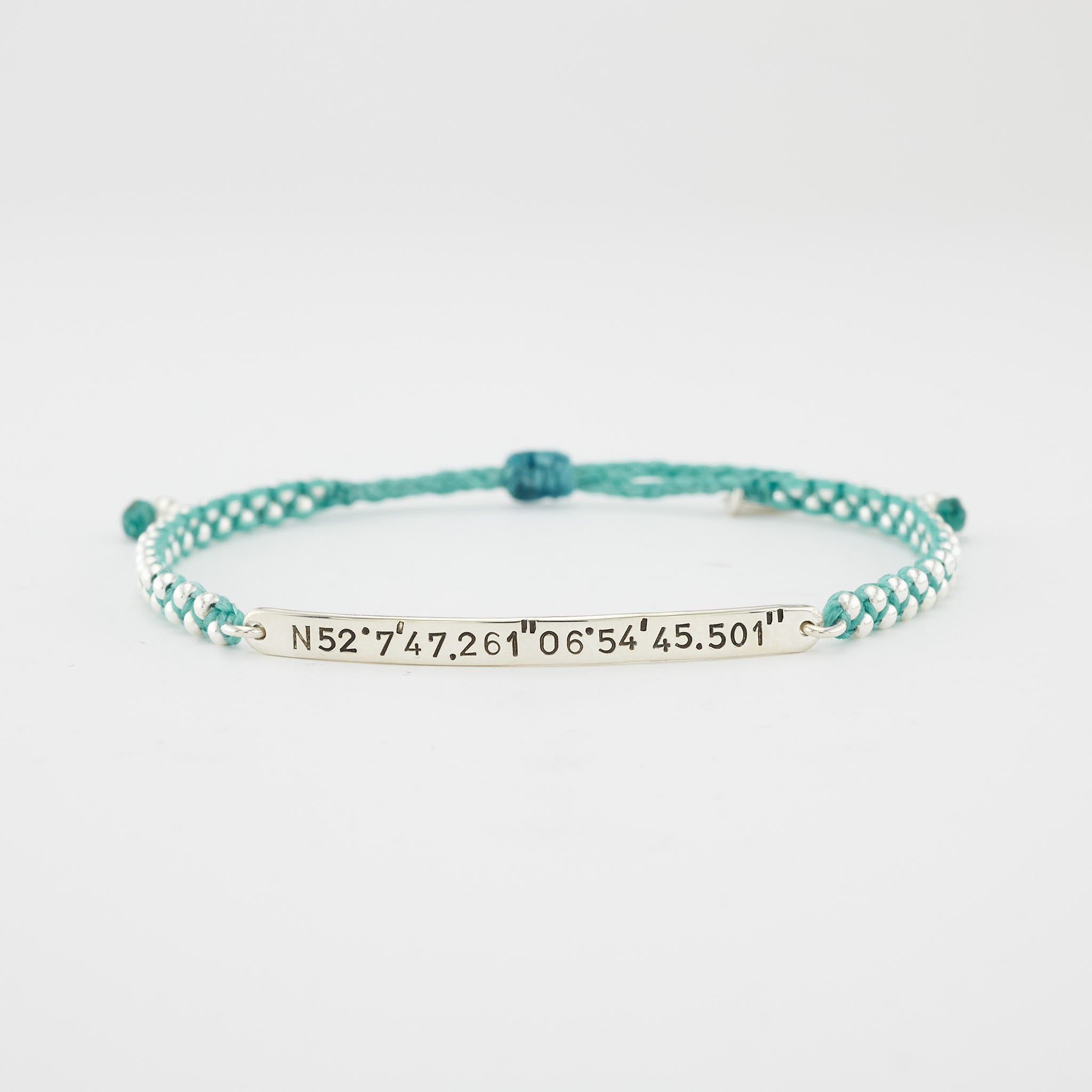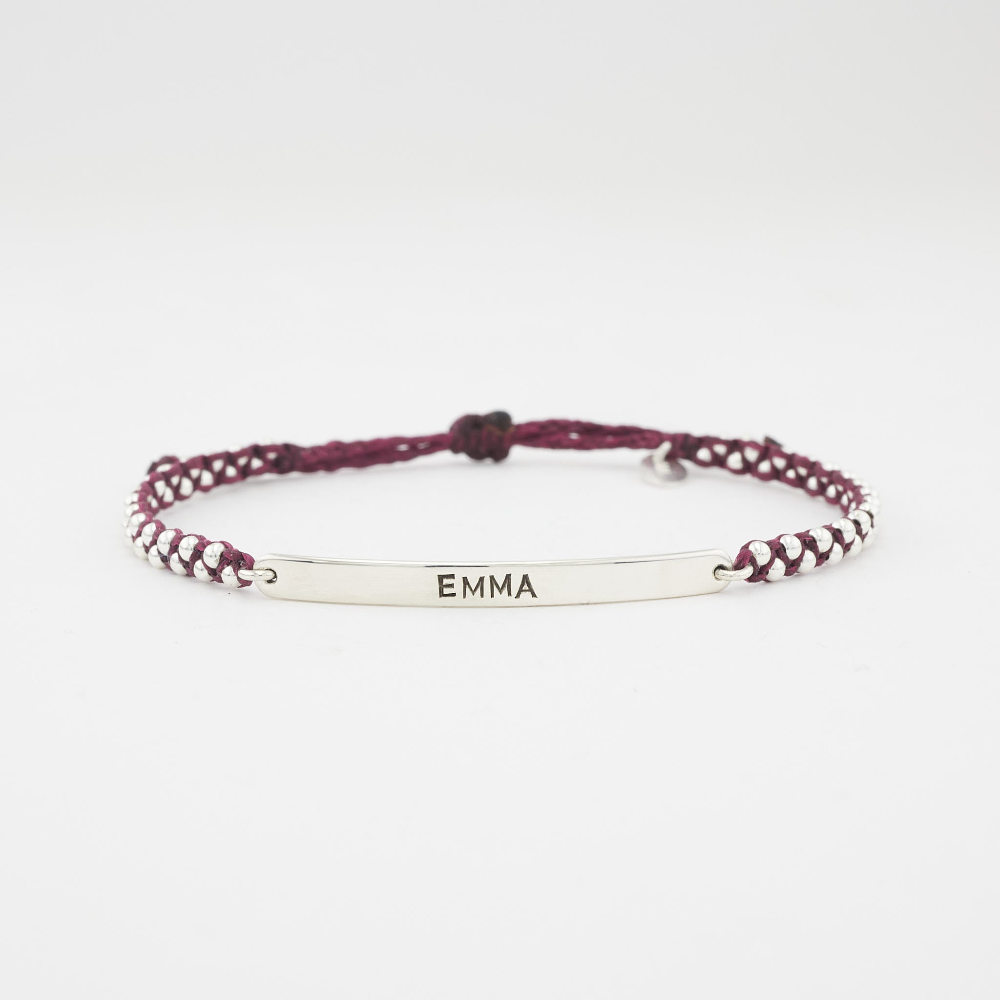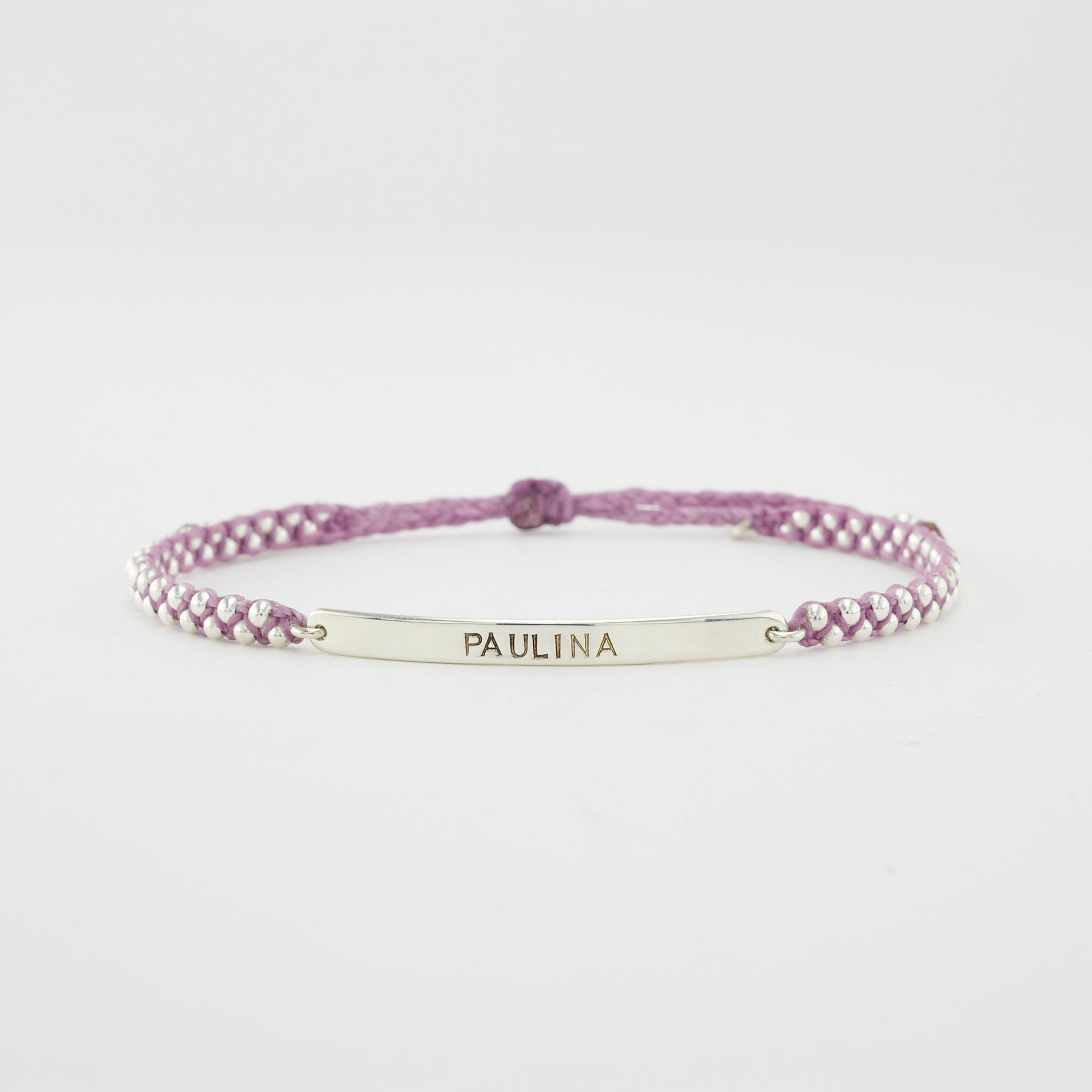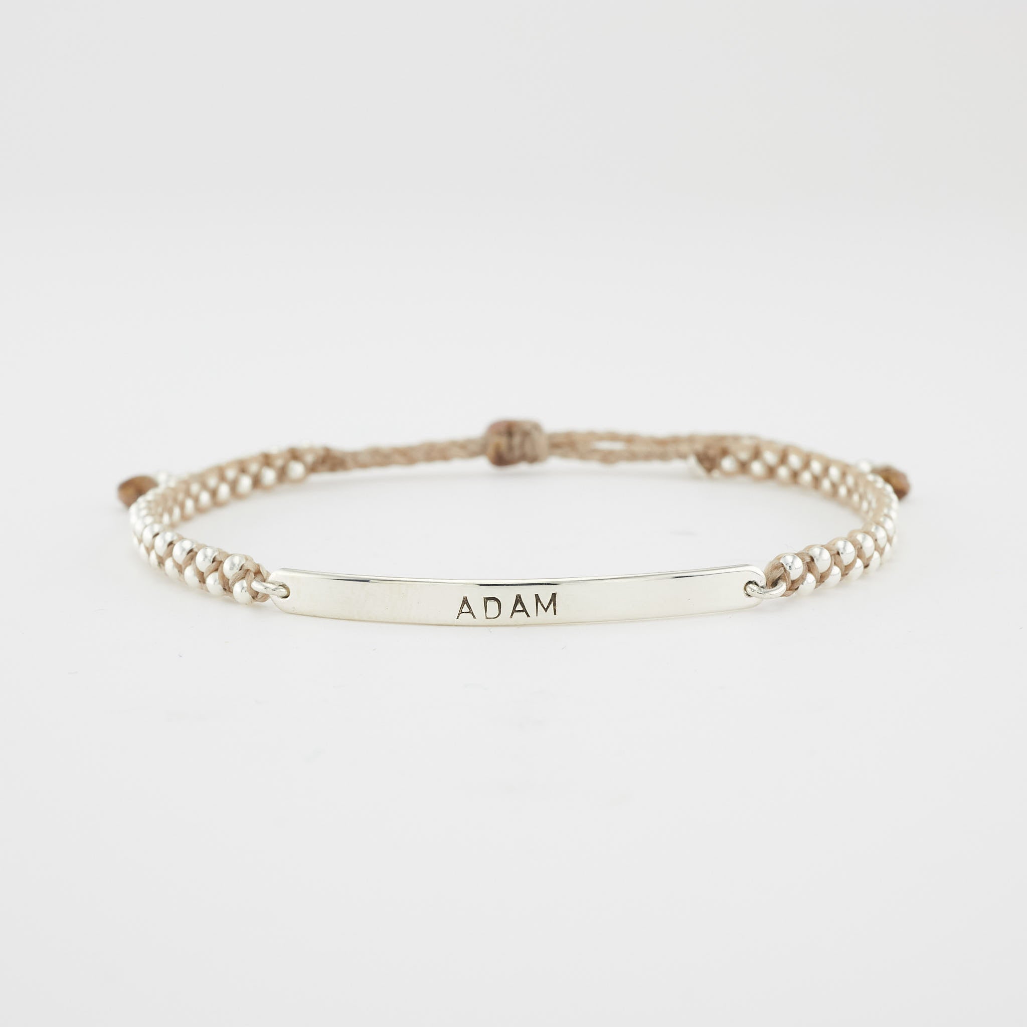 handgefertigtes und personalisierbares Namensarmband mit filigranen 925 Sterling Silber Perlen ( 2 mm ) und leicht gebogenen 925 Sterling Silber Plättchen ( 37x3,5x1mm ) mit beweglichen Ösen, welches beidseitig beschriftet werden kann; Schrift hat eine Höhe von 1,5 mm und es können bis zu 20 Zeichen einpunziert werden; zart und dennoch robust