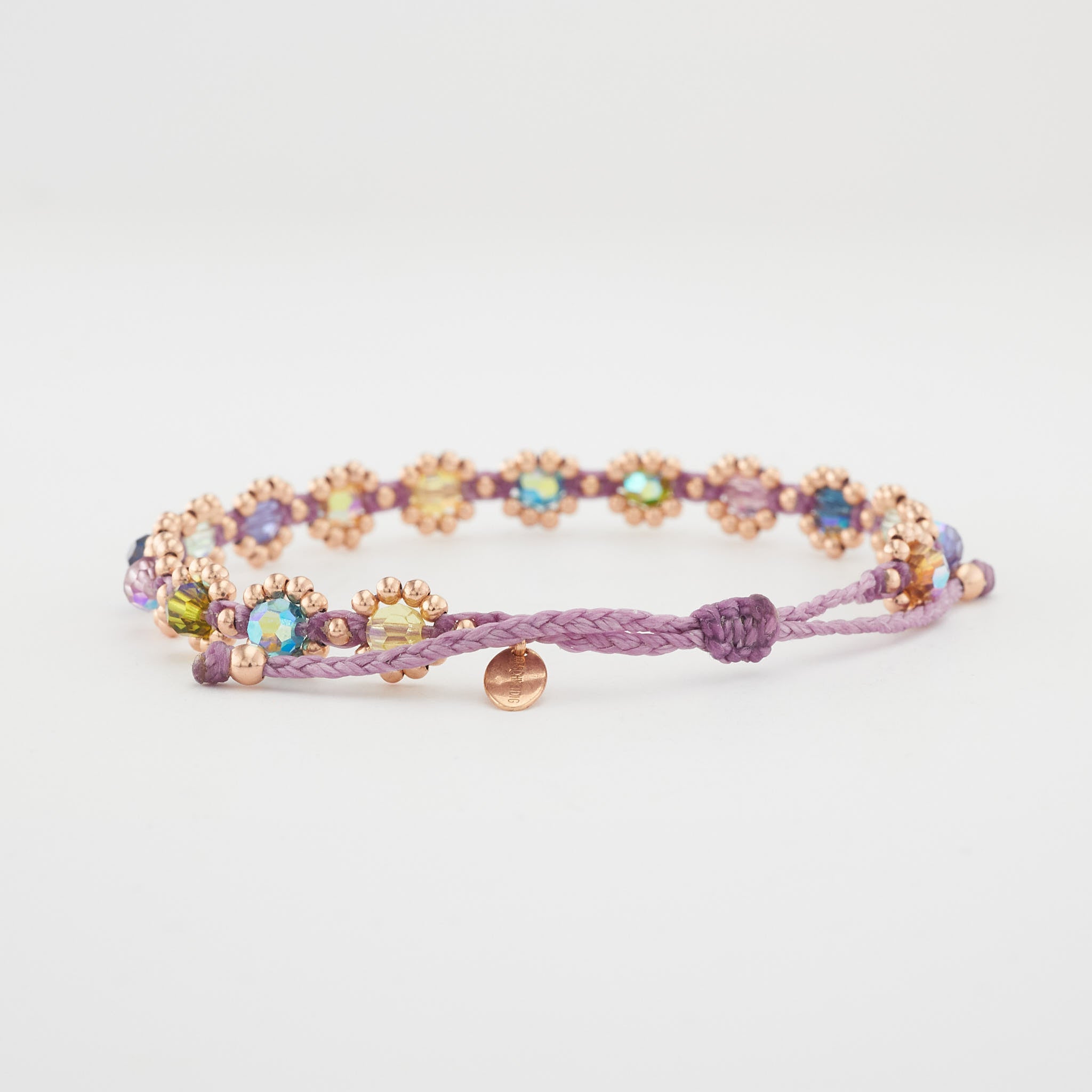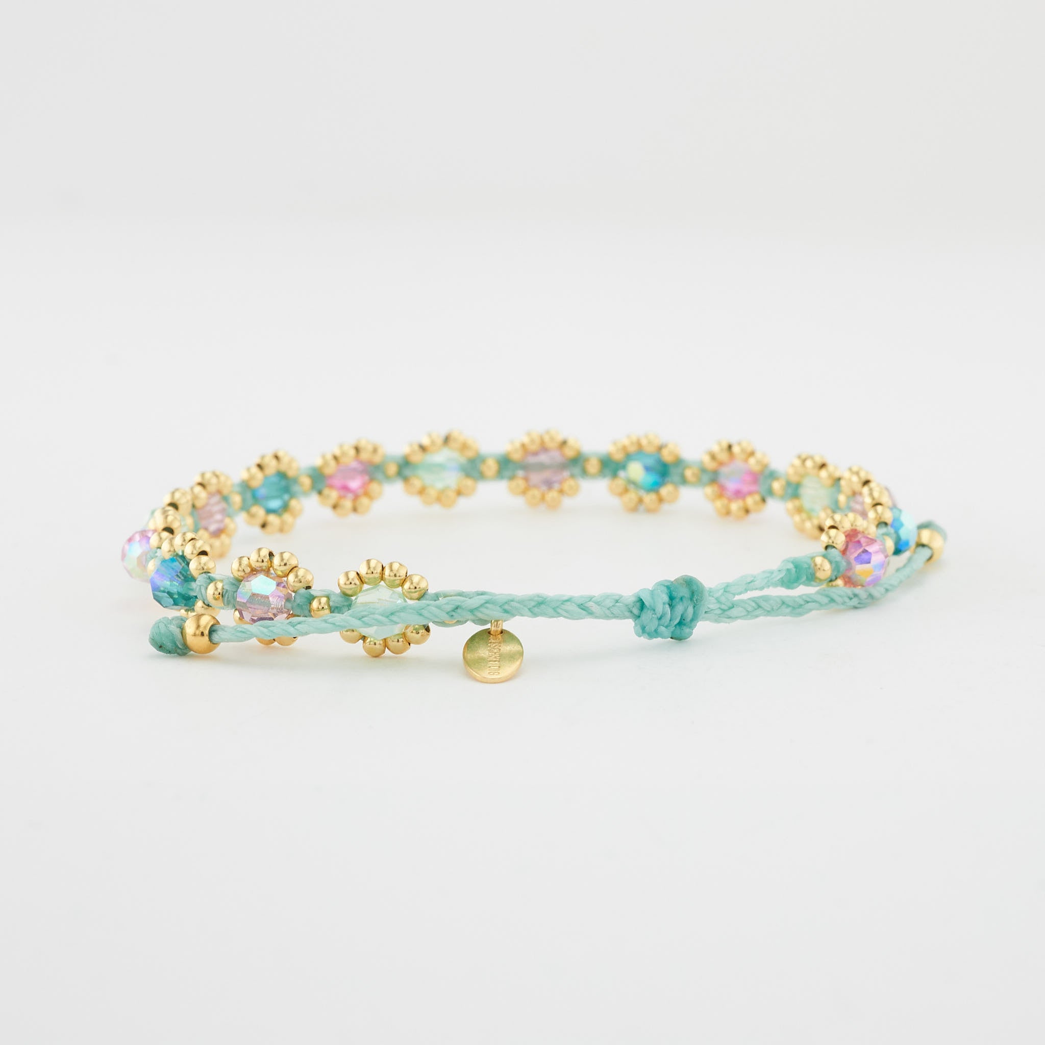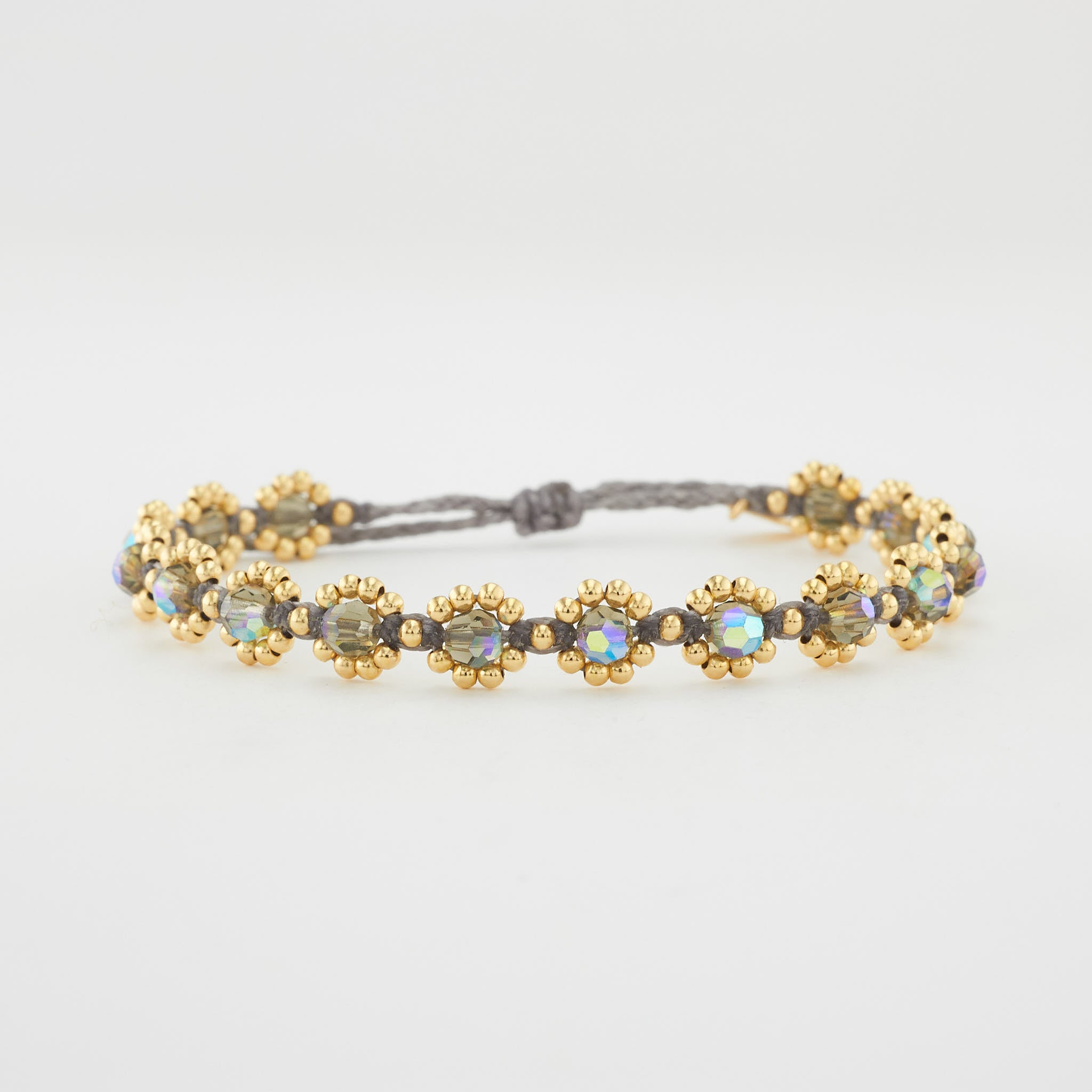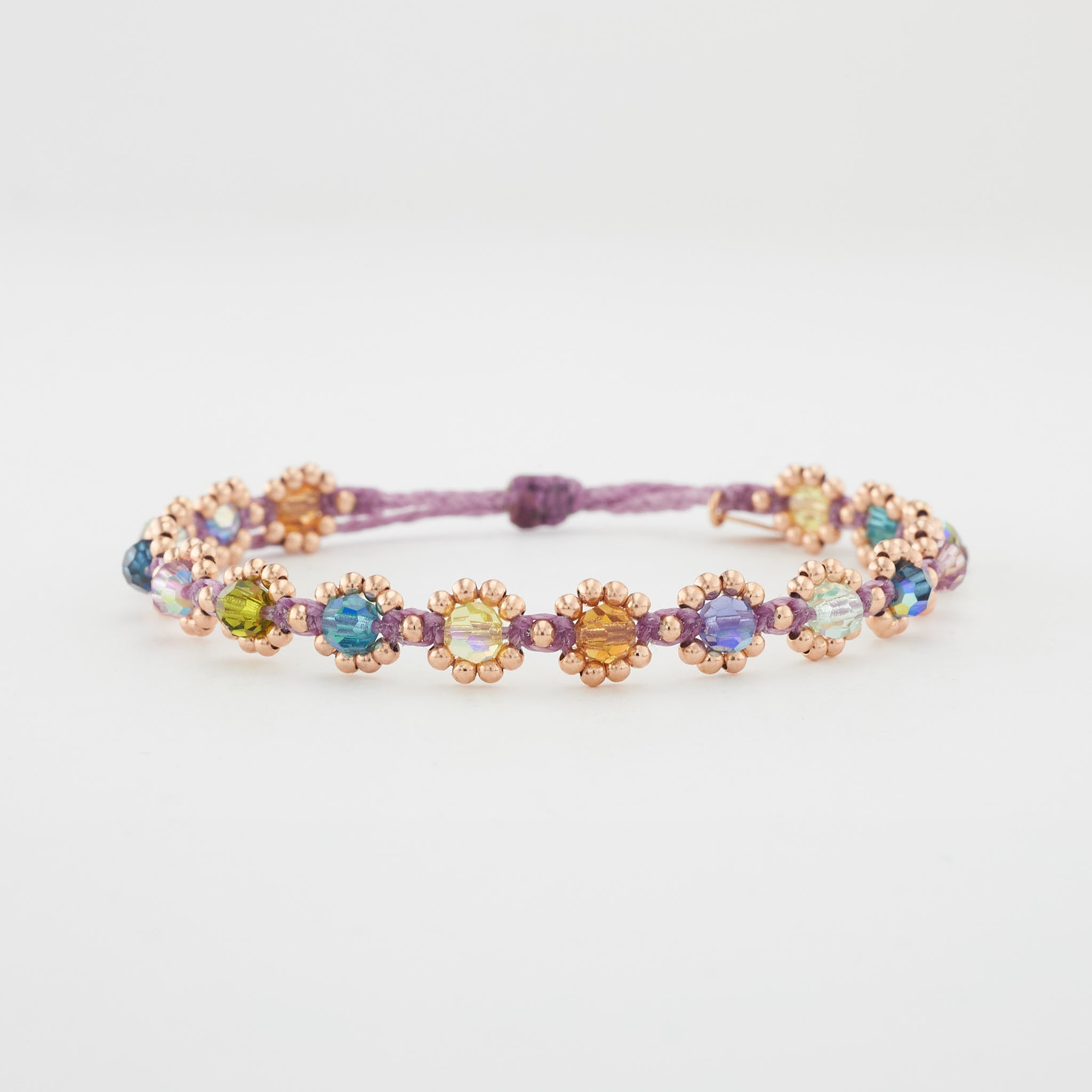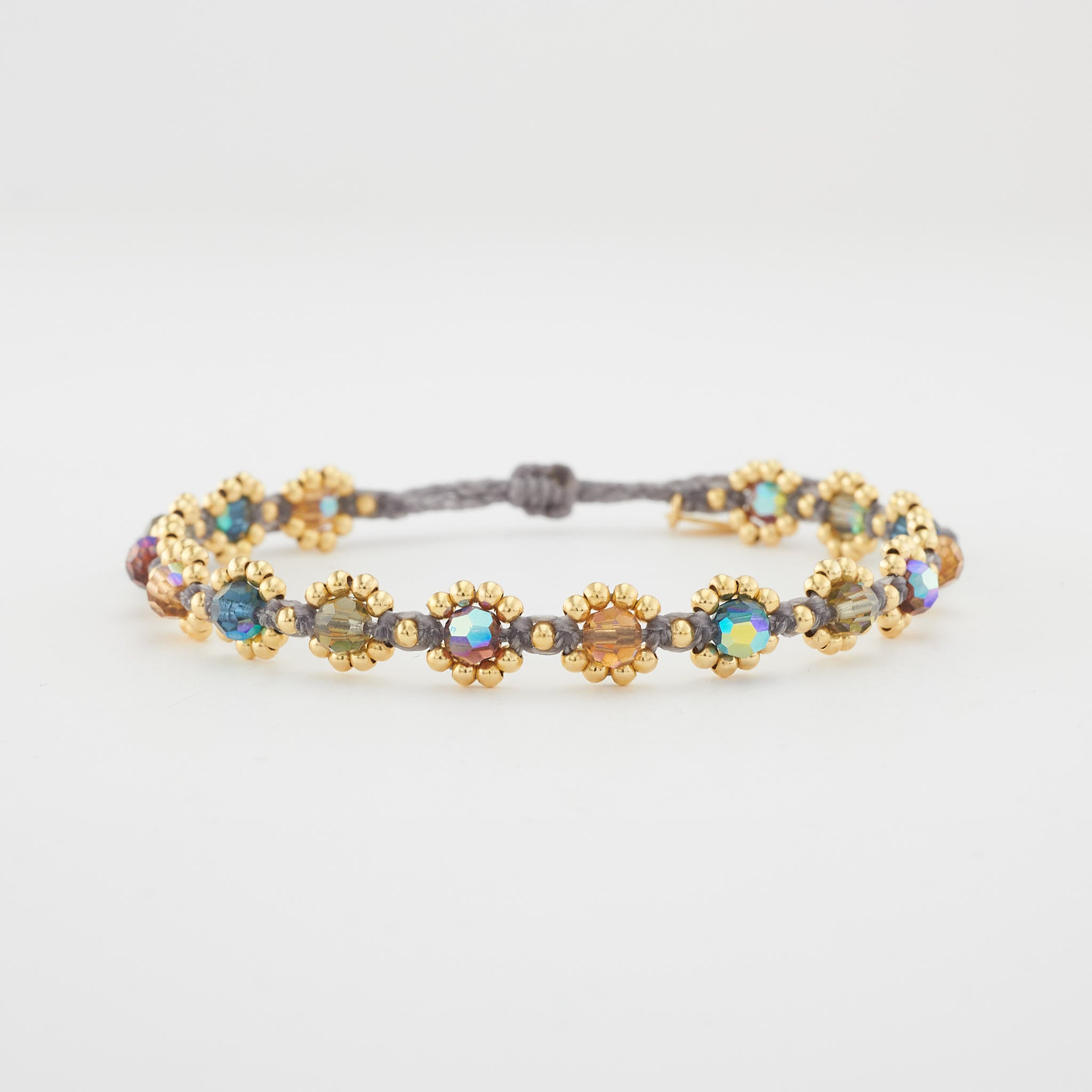 handgeknüpft aus filigranen 925er Sterling Silber Perlen (2 mm ) mit 18 Karat Gelbgold vergoldet und farbigen Kristallperlen ( 4 mm ); in filigraner Handarbeit gefertigtes Armband