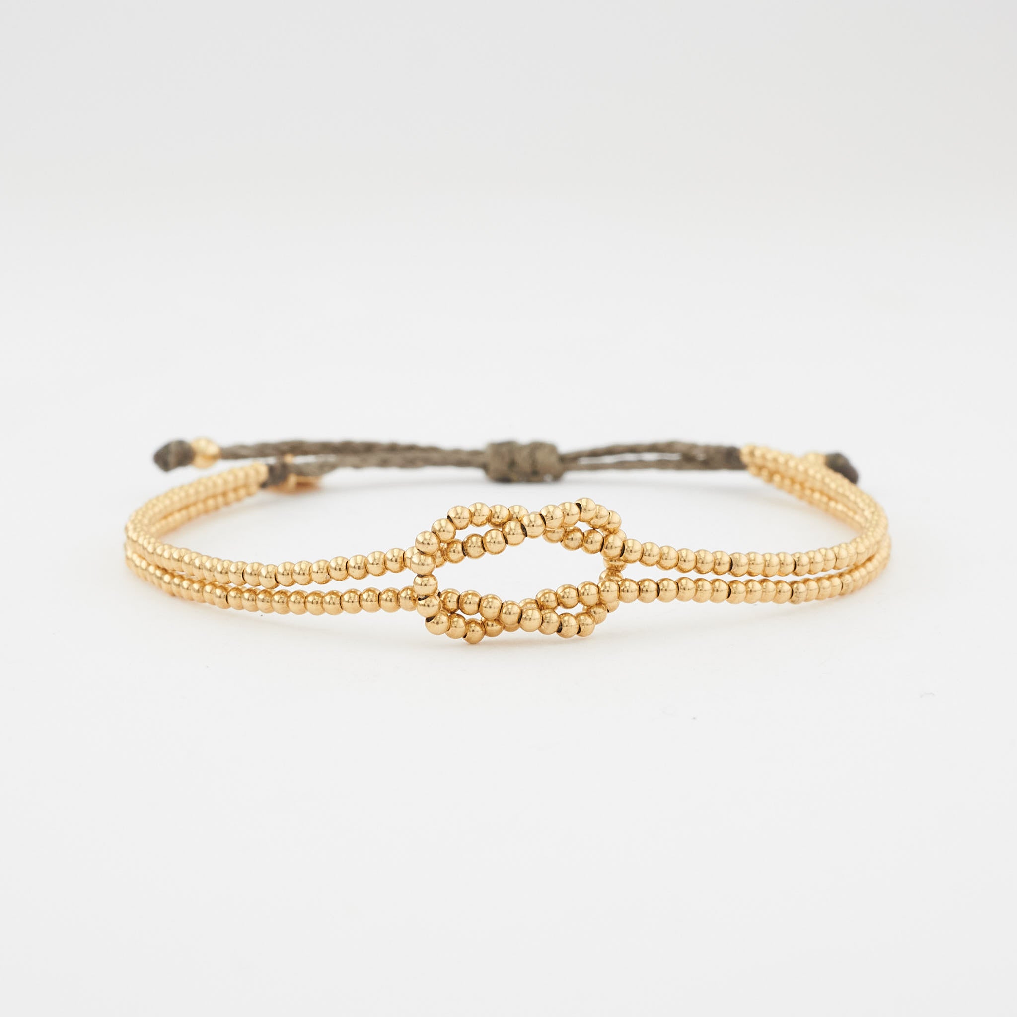 handgefertigtes, verschlungenes Armband aus filigranen, glatten 18 Karat Gelbgold Perlen (1,8 mm); Knotenschlaufe symbolisiert Verbundenheit, Freundschaft, Liebe und Unendlichkeit
